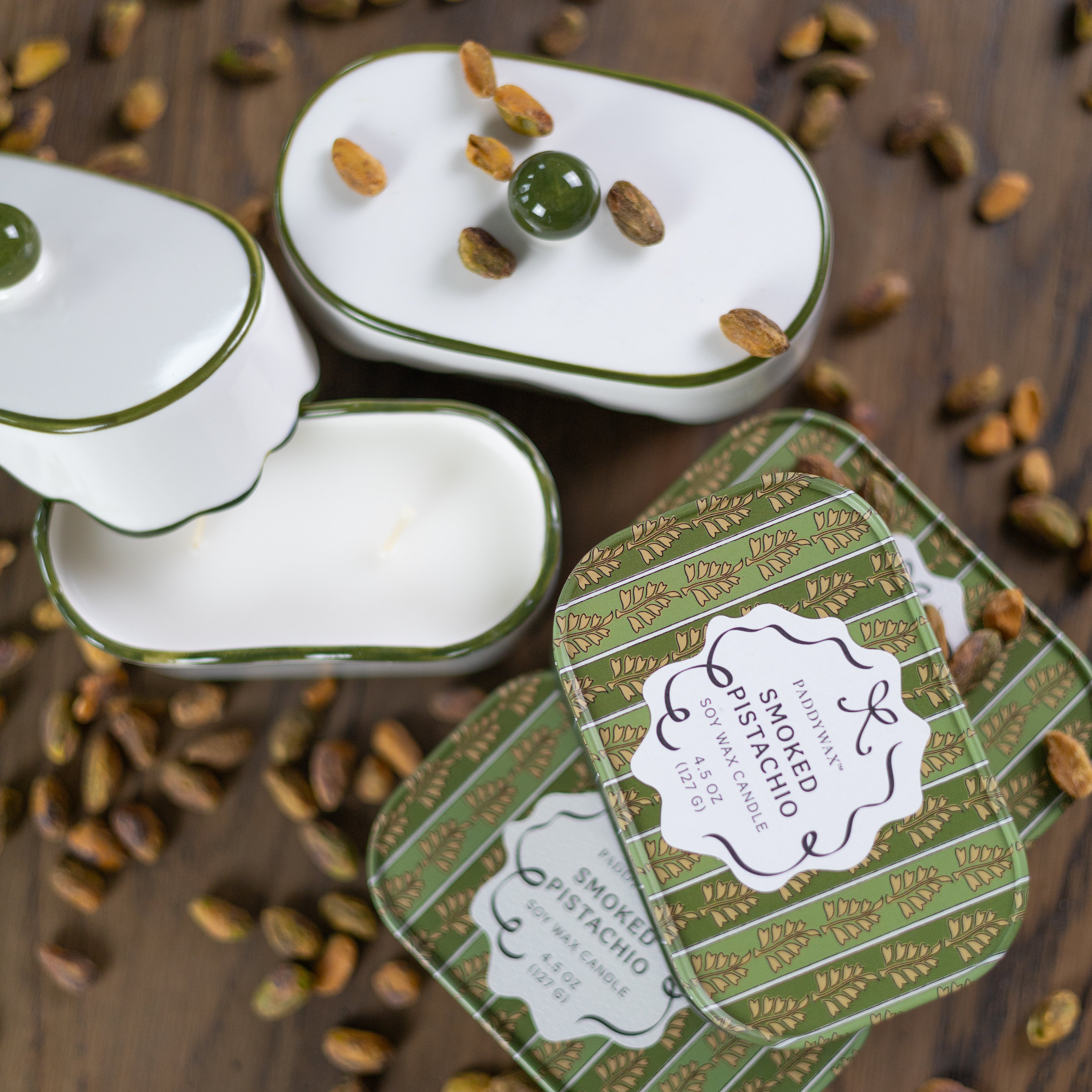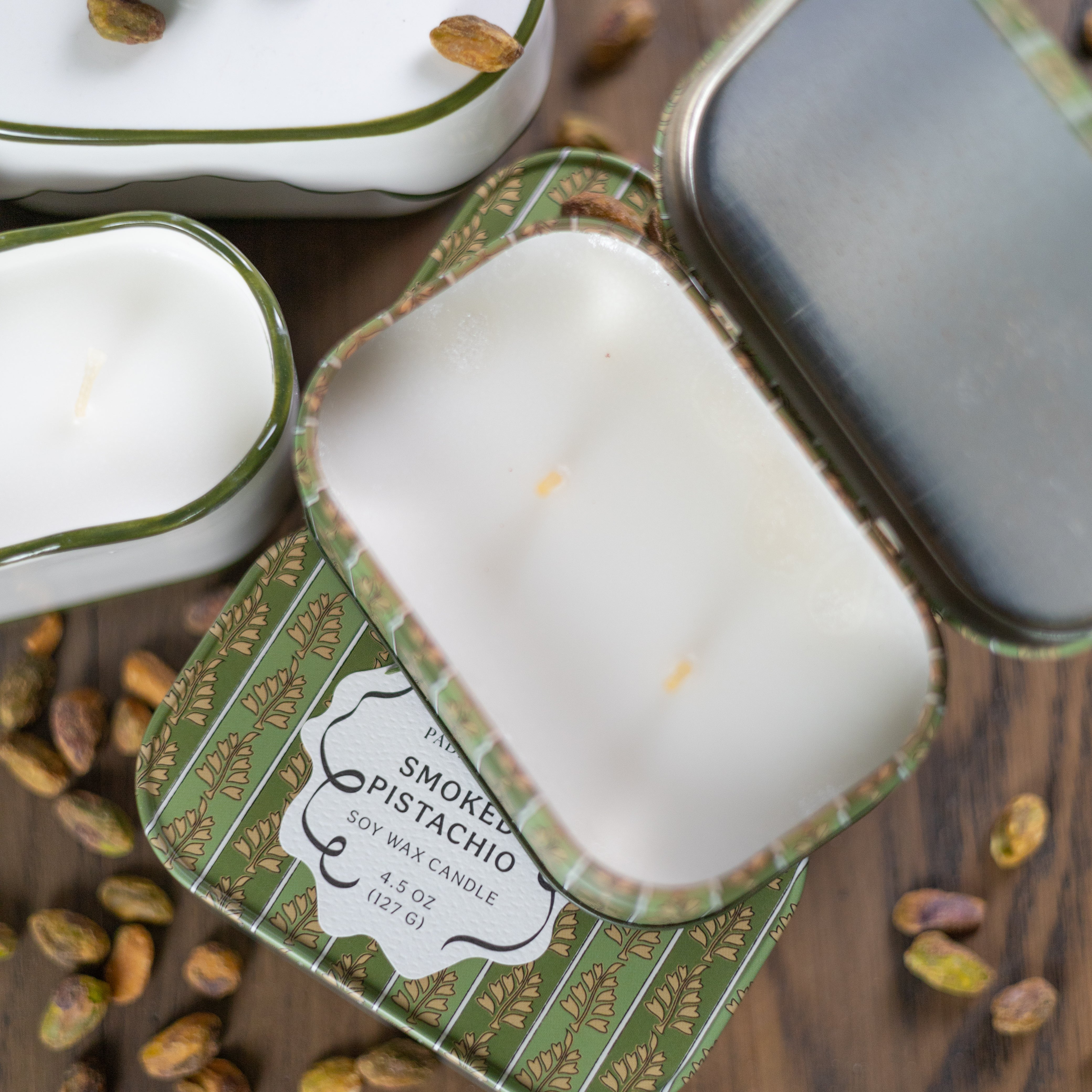 Perfect for gifting or personal indulgence, the Smoked Pistachio Tin Candle combines artisanal craftsmanship with practical design. Its two-wick format ensures even burning and a more intense fragrance experience, making it ideal for cozy nights, self-care rituals, or adding a warm touch to any room.