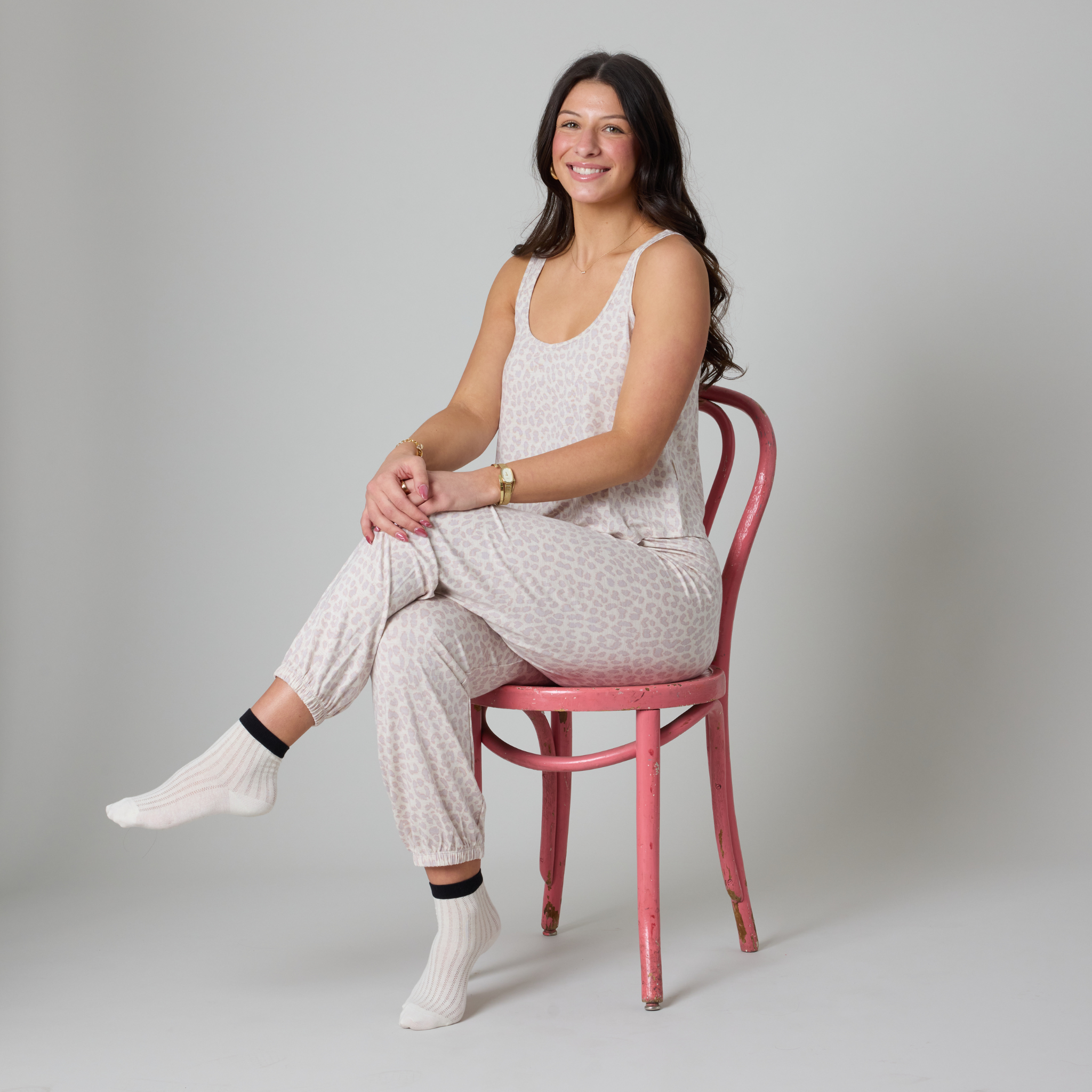 Take a snooze on the wild side. This beige leopard pajama set is crafted from soft jersey with a silky-soft, breathable feel, perfect for serious unwinding. The banded pants are finished with an elastic waistband and adjustable drawstring for all-night comfort. Pair with our Luxe Leopard Dreams Tank Top and complete the look for your sleep-and-lounge rotation.