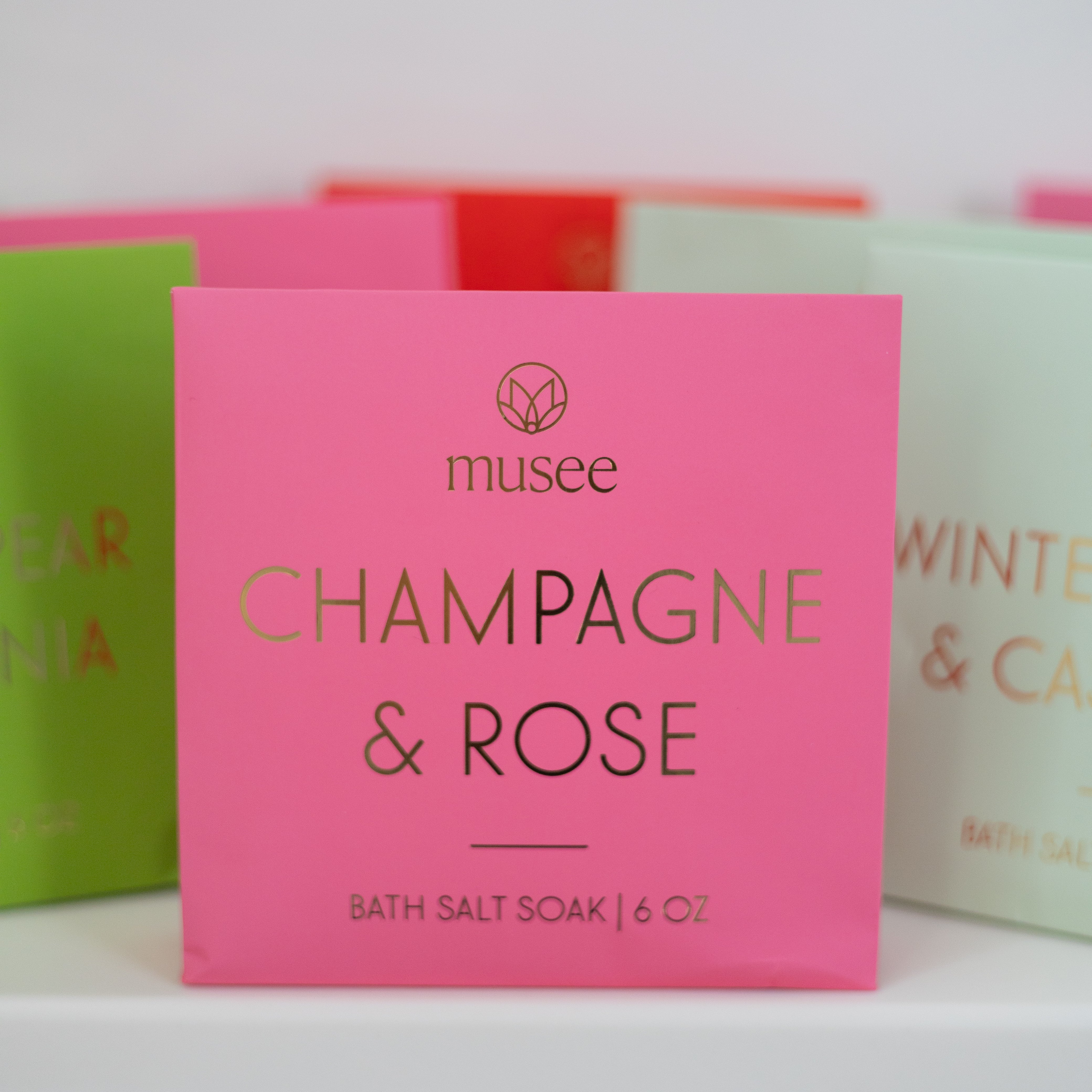 Elevate your bathing routine with Champagne Salt—a luxurious champagne and rose Epsom and sea salt bath soak that hydrates, softens, and revitalizes your skin while providing a calming, spa-quality experience at home.